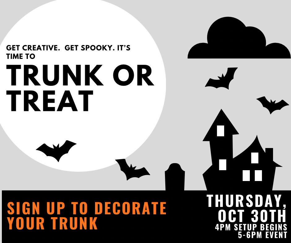 Save the date for Trunk or Treat on Thursday, 10/30 from 5pm until the candy runs out! More information and a giant candy drive will happen closer to the event, but we need all the creative, fun trunks to start crafting!