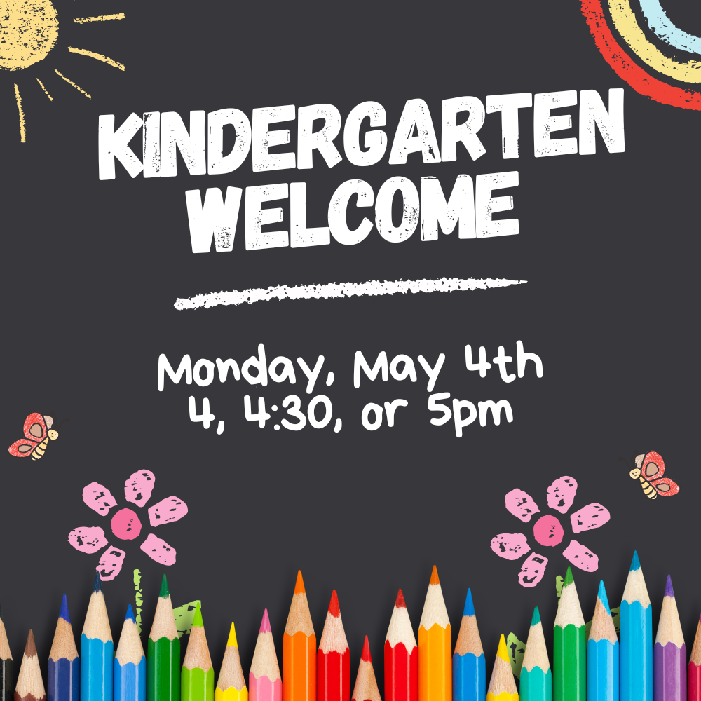 We’d love to invite you to our Kindergarten Welcome Event on Monday, May 4th at 4, 4:30, or 5 PM. Please choose one 25-minute time slot that works best for your family.