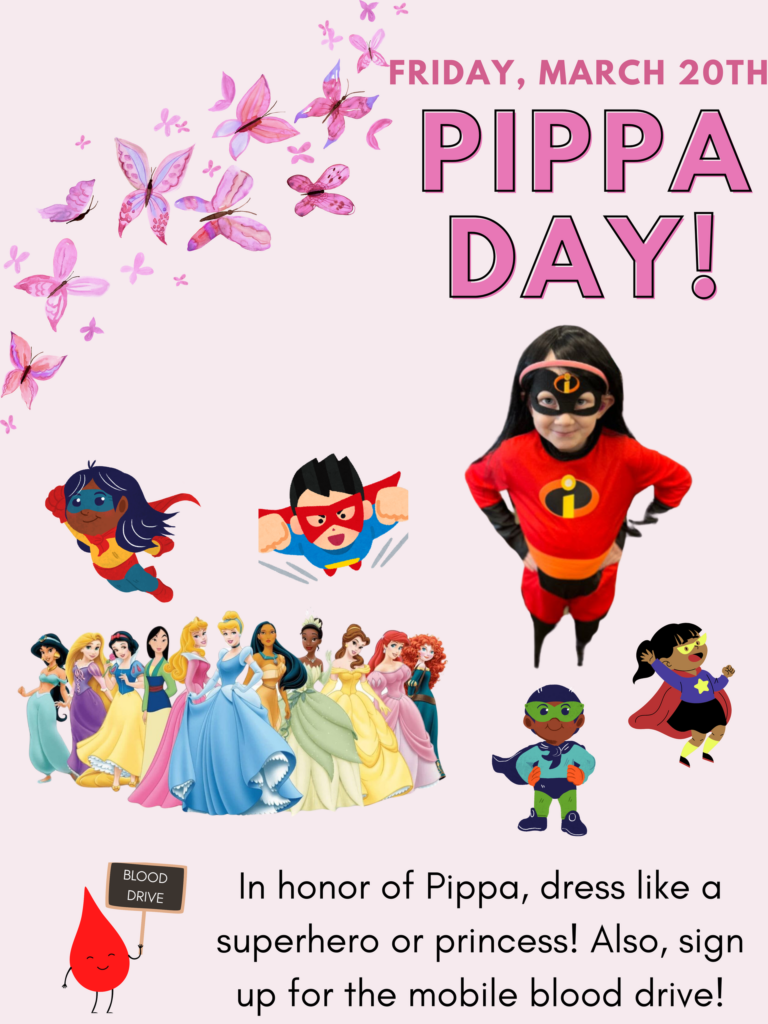 Pippa made everyone around her smile and we were all in awe of her strength. She loved coming to school dressed in full costume, whether it was from the Incredibles, Hermione Granger, all or any of the Disney Princesses or superheroes. To honor her love of superheroes and costumes we are going to encourage everyone to come to school dressed as a superhero, princess/prince, Disney character, or butterfly.