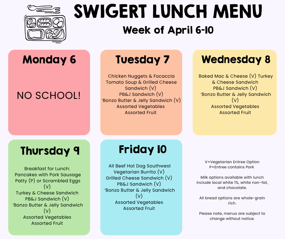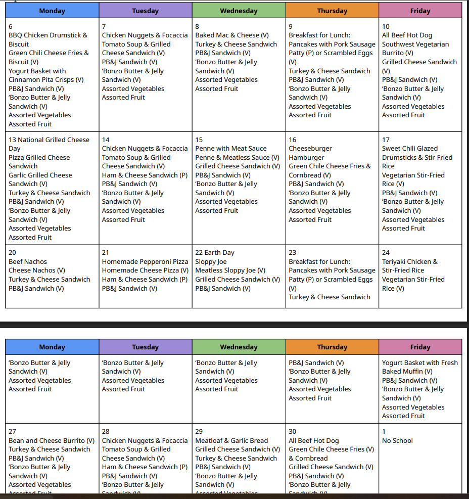 They can also be viewed on schoolcafe.com. They have an app as well. Here is a the April lunch calendar: